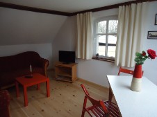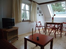 Die Ferienwohnung im Dachgeschoss bietet helle und freundliche Räume, die zum Wohlfühlen und Entspannen einladen. Das Wohnzimmer mit großer Eckcouch, SAT-